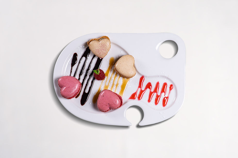 Delicate almond meringue confections with assorted ganache, buttercream, and fruit fillings.